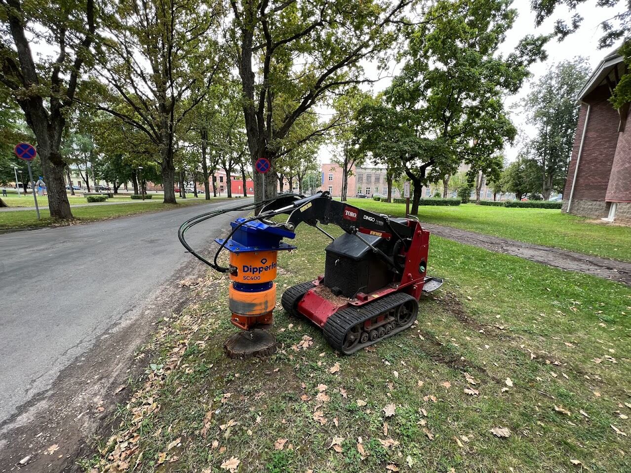 - Díky kompaktním rozměrům a malému nosiči je možná likvidace pařezů těsně u domů, v úzkých prostorech, bez poškození okolního asfaltu, dlažby, betonu, není potřeba přesun kamenů či velkého množství zeminy.
